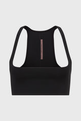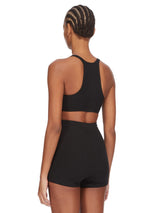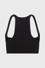Unhorny top in black compact stretch jersey from Rick Owens Lilies SS25 Hollywood. This unhorny top is a slim tank top that covers most of the breasts. It has a wide, square, neckline and thin shoulder straps that flow into a racer back. It features the signature single seam running down the centre back spine.