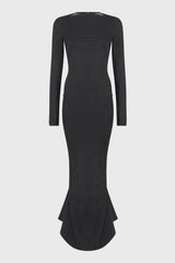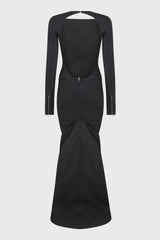 Luna gown in black chalk stretch denim from Rick Owens FW24 Porterville runway. This luna gown is trailing floor length and has a close-to-the-body fit with long sleeves and zippered cuffs. It has a boat neck, level shoulder seams and an open back. It features a signature geo seam running across the front chest and slanting diagonally down the side body, and seams curving over the hips and down the front leg to the hem. It flares into a fishtail train with a godet at centre back and secures with a centre back zip. This version is fully lined with two internal zipped pockets.