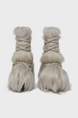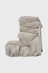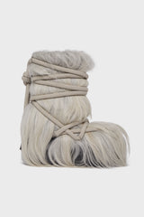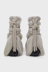 Lunar mega tractor in pearl/black goat from Rick Owens FW24 Porterville. These lunar mega tractor are above-ankle height. They have a soft padded pull on boot upper and a double-height mega tractor sole. They are criss-crossed with jumbo penta lacing.