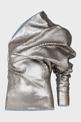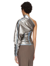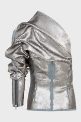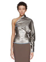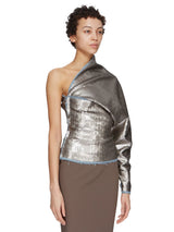 One sleeve top in blue and pearl sequin embroidered stretch denim from Rick Owens FW23 Luxor runway. This one sleeve top is hip length with a tight fit. It has an asymmetrical neckline with one shoulder. It drapes very slightly across the chest, ballooning into a draped shoulder with a single left long sleeve, with an exposed zippered cuff. It closes with a side zipper on the right.