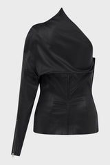 One sleeve top in black stretch lamb leather from Rick Owens FW23 Luxor runway. This one sleeve top is hip length with a tight fit. It has an asymmetrical neckline with one shoulder. It drapes very slightly across the chest, ballooning into a draped shoulder with a single left long sleeve, with an exposed zippered cuff. It closes with a side zipper on the right. This stretch lamb leather has a small grain texture and a matte finish.