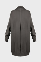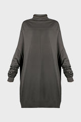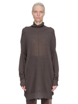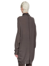Oversized crater in darkdust lightweight rasato knit from Rick Owens AW25 Concordians. This oversized crater is below hip length with a jumbo loose fit. It features a high ribbed crew neck with slight cowl, a wide dropped shoulder and armhole with long ribbed sleeves and a ribbed hem. It has a signature knit channel running down the centre back spine.