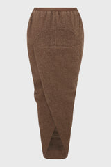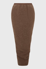 Pillar long skir in fawn lodenette from Rick Owens FW24 Porterville. This pillar long skirt is ankle-length. It has an elasticized waistband, a skirt which tapers to the ankle, and a cross split in the centre back seam, up to the knee.