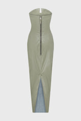 Prong gown in celadon coated stretch denim from Rick Owens. This prong gown is floor-length. It features a strapless structured bodice with a boned geometric cut-out front and folded bust detail. It has a tight-fitting skirt which tapers slightly to the ankle with a high centre back split, and exposed zipper closure. This lightweight stretch denim is covered with a semi-shiny and soft coating. The indigo color and structure of the denim shines through the color of the coating creating a multilayered and irregular coloration.