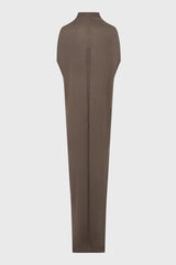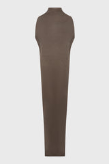 Sl crater dress in dust lightweight rasato knit from Rick Owens ss25 Hollywood. This sl crater dress is floor length and sleeveless with a loose fit. It has a high-ribbed crew neck with a slight cowl. It has a dropped shoulder and armhole and signature level shoulder seams and a knit line running down the centre back spine. It features sacri splits on each side seam reaching the mid-thigh, and a skirt that tapers slightly to the hem.