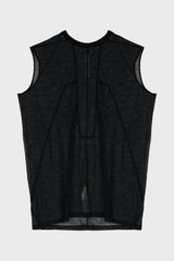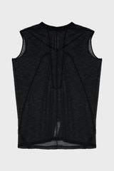 This tarp t is below hip length with a loose fit. It is sleeveless with wide shoulders and a ribbed crew neck. It has signature front level shoulder seams and single seam running down the centre back spine.