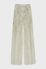 This mediumweight milk megacrust denim is overdyed dust and then treated with layers of milk colored foil that is pressed on by hand.
