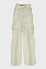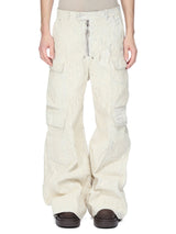 Tailored cargobelas in 13oz milk megacrust denim from Rick Owens FW25 Concordians. These tailored cargobelas are full-length with a low crotch and wide leg. They feature a waistband with belt loops, button closure and a bela exposed center zipper with two snap detail at bottom. They have side welt pockets with rivet and eyelet detail, four beveled cargo pockets on the side leg and two rear welt pockets with visible button closure and topstitching.