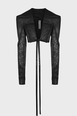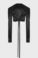 Tight jkt in black 13oz black megacrust from Rick Owens FW25 Concordians runway. This tight jkt is waist length. It is close-fitting, with long sleeves, and an open front that secures with a long tie that then wraps around the waist. It features structured, wide tatlin shoulders with a girdered shoulder seam, and yoke that is horizontal across the chest and descends down the arm, to finish in a blunt point at the elbow.