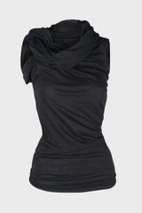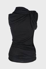 Twist t in black rainino jersey from Rick Owens FW25 Concordians. It has one, right, covered shoulder, and a twist of fabric that runs over the right shoulder, asymmetrically across the chest to the left shoulder, where it twists in a knot, and wraps to connect around the left arm. It has a centre back split and a knit line running down the centre front and centre back.