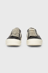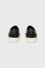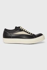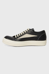 Vintage sneaks in black/milk/milk full grain calf leather and velour suede from Rick Owens AW25 Concordians. These vintage sneaks are under-ankle height and have eight eyelets with laces, toe caps and shark toothed bumper soles. They feature a triangular leather applique on the side foot, a padded ankle and contrast stitching.