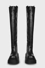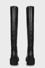 Wader bogun in black washed calf leather from Rick Owens FW25 Concordians runway. These wader bogun boots are thigh-high. They have rounded toes, a geometric heel counter that continues up the back calf and two pull tabs in webbing. They have a bogun rubber mega creeper sole with a toothed square heel.