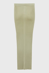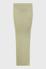 Sacriskirt in celadon lightweight ribbed knit from Rick Owens SS25 Hollywood. This ribbed sacriskirt is above ankle length with a close to the body fit. It is a fully fashioned ribbed knit with a thin, elasticized waistband. This tapered skirt has side seam splits reaching mid-calf and a signature knit line running down the centre back. This is a lightweight and soft classic ribbed wool knit.