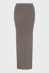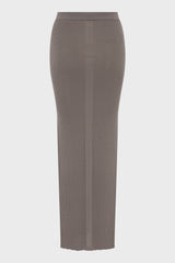 Sacriskirt in dust lightweight ribbed knit from Rick Owens. This ribbed sacriskirt is above ankle length with a close to the body fit. It is a fully fashioned ribbed knit with a thin, elasticized waistband. This tapered skirt has side seam splits reaching mid-calf and a signature knit line running down the centre back. This is a lightweight and soft classic ribbed wool knit.