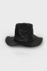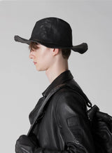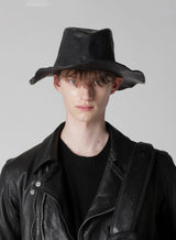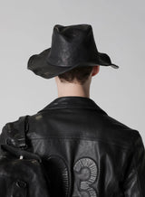 Ten gallon hat in black from Yohji Yamamoto x BACKLASH. This collaboration piece features a unique TENGALLON HAT crafted from calf leather. Its standout characteristic is its vivid coloration with minimal color inconsistencies, achieved through using yarn-dyed leather and applying a wash process.
