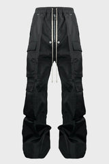 Double cargo jumbo belas in black nylon canvas from Rick Owens DRKSHDW FW25 Concordians. These double cargo jumbo bela pants are full-length with a low crotch and wide leg. They feature an elasticized waistband with drawstring and a bela exposed center zipper with two snap detail, and side welt pockets with rivets. They feature two beveled cargo pockets on the thigh, with two square cargo pockets below and two square back pockets. They all have flaps and topstitching.