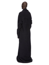 Long cardigan in black alpaca knit from Rick Owens FW25 Concordians runway. This long cardigan is floor length with long sleeves and an ample fit. It has an open front with a wide ribbed shawl collar that can be worn, hood-like, up over the head. It features a wide knit shoulder line, and side front pockets. It has wide ribbing lines descending from the upper arm to the wrist and a signature knit channel running down the centre back spine.