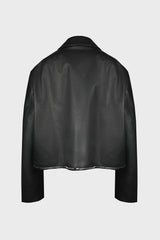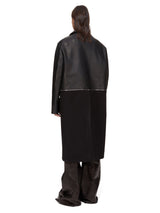 Blixa Jumbo Mac in black washed calf leather and melton from Rick Owens FW25 Concordians runway. This blixa jumbo mac is below knee length with long sleeves and a square fit. It has a classic collar and a centre zipper opening, blixa two-way zippered chest pockets and two lower flap pockets on front as well as the harness detail on front chest. It features the it features a zip hem, allowing pieces to be converted into longer or shorter garments. This blixa jumbo mac is coat length but can be unzipped into a cropped piece. The zips can also be partially undone, allowing the bottom half to drape behind. It has a centre back vent. It is fully lined with two internal zippered pockets.