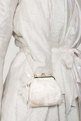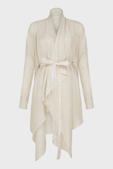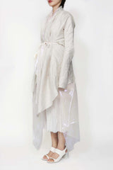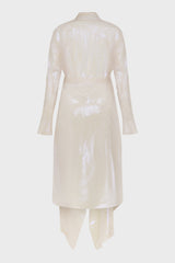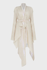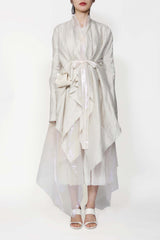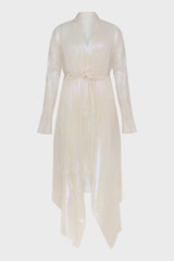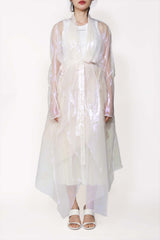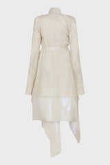Off white flared coat from Leon Emanuel Blanck, featuring double-layers- detachable iridescent inside layer, rough edge finishing and drapy neckline.