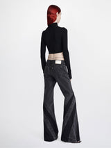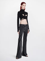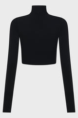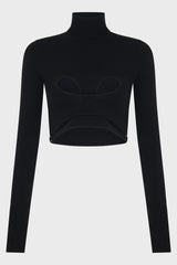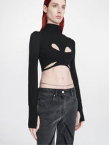 Mobius loop longsleeve top from Dion Lee. It is a long sleeve knit crop top in a luxe merino blend. Featuring a looping layered construction at front with cut-outs. Detailed with signature e-hook hardware. High neck and extended sleeves with thumbholes at inseam.