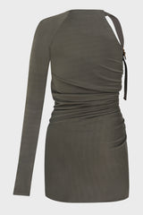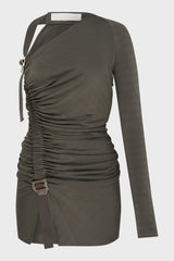 Utility sleeve gather dress from Dion Lee. It is an asymmetric mini dress with single long sleeve cut in a lustrous viscose jersey. Fabrication has a luxe, slinky hand and gathers along wide elastic at side body. Detailed with signature two-tone safety slider hardware. Elastic halter neck strap is adjustable. Invisible zip closure at side.