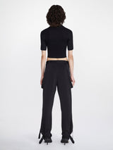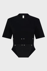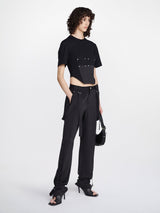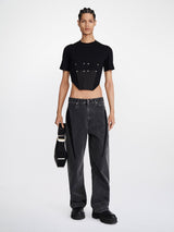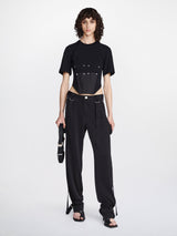 Workwear corset tee from Dion Lee. It is a crew neck tee crafted in a dry organic cotton jersey with corset detail at front. Patch pocket panels at front cut in a contrast technical sustainable cotton nylon and detailed with logo-engraved rivets. Internal boning for a fitted waist with a relaxed upper. Pull-on entry.
