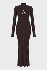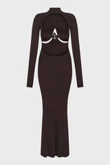 Double underwire bra dress from Dion Lee. It is a long sleeve full length dress crafted in a lustrous viscose rib knit. Featuring an integrated double monowire for a cut-out at underbust. Knit strap at open back with signature e-hook fastening. Designed for a close fit through the body with a gently flared skirt.