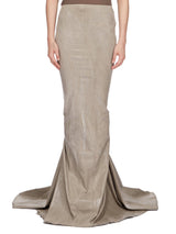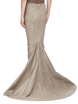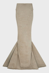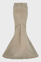 AL pillar skirt in pearl overdyed foil stretch denim from Rick Owens DRKSHDW ss24 lido. This al pillar skirt is ankle-length with a tight fit. It has an extra high waist and seams curving over the hips, and down the front leg, to the hem. It is tight to the knee and then flares into a fishtail train at centre back and has a raw cut hem. This lightweight stretch denim is overdyed with a clear foil overlay that creates the waxy touch.