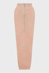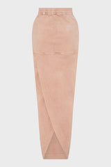 Pull on pillar skirt in dark pink overdyed foil stretch denim from Rick Owens DRKSHDW ss24 lido. This pull on pillar skirt is full length at front and open to knee height at the rear. It has an elasticized waistband with drawstring and two side front pockets. The skirt wraps to the back, creating a centre back split opening and draping effect. This lightweight stretch denim is overdyed with a clear foil overlay that creates the waxy touch.