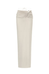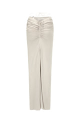 This cinched tie-fastning jersey skirt in griege from Oude Waag is fitted with ties at the high waist. The brand’s metal pig-nose buttons can be used to adjust the gathering at the side to accentuate your curves, ensuring adaptability and flexibility.