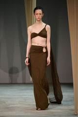 This knotted jersey top in brown knitted rayon fabric from Oude Waag. The knotted-detail creates a ruched texture, while the one-shoulder neckline can draw attention to your collarbone and decolletage, adding a feminine touch.
