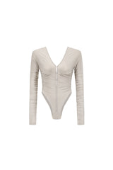 This v-neck jersey bodysuit from Oude Waag is knitted from cupro that is fluid and breathable. The ultra stretchy bodice fits comfortably. The allure plunging neckline is gathered at both sides to accentuate your curves, while the subtle cutout at the front can reveal a flash of skin. The adjustable neckline allows you to find the perfect fit depending on the rest of the outfit.