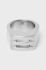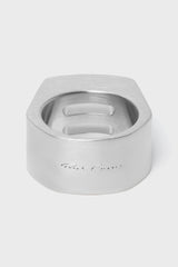 Grill ring in brass from Rick Owens SS24 Lido. This grill ring is a thick band with two grill openings. It has the rick owens logo engraved on the back. This jewlery piece has a semi-shiny brushed palladium finish.