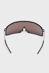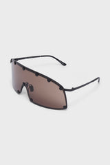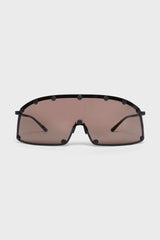Shielding sunglasses from Rick Owens. These sunglasses feature a black surgical stainless steel frame, a straight-bottomed brown lense and a rubber nose pad.