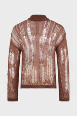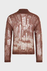 Tommy lupetto in henna net knit from Rick Owens ss24 lido. This tommy lupetto is below hip length with a jumbo oversized fit. It has wide, long sleeves with a dropped armhole, a ribbed high crewneck, ridged seams and splits in the side seams. It features the signature knit channel running down centre back. This is a net knit with uneven holes.