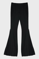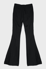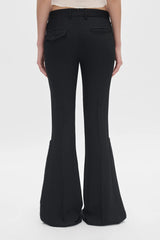 Fie bootcut trousers with cady satin raw edge detail on side from Ann Demeulemeester. It has a slim fit through the thigh, flared leg with raw-edge side inserts, pressed crease detailing, mid-rise waist with belt loops, concealed zip and button closure, back welt pockets with flap detail and fluid tailored construction .