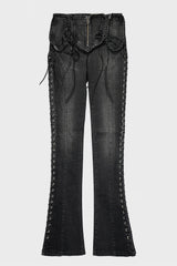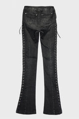 Slim fit jeans with eyelets and laces from Blumarine, designed with retro appeal, featuring a 70's style flared-leg silhouette. Made from stretch-infused cotton denim, they sit low on the waist and are finished with a zipped front.