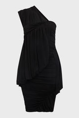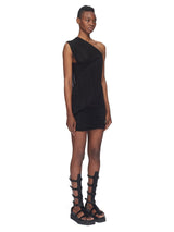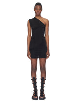 Edfu dress in black stretch cupro jersey from Rick Owens SS23 EDFU. This edfu dress is mid-thigh length. It has a draped asymmetrical neckline with single right shoulder and tight fitting ruched body. It features a geometric draped shape running across the right breast, cutting on the diagonal to travel down the body, then around the right hip.