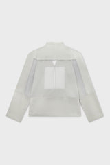Square sheer cut-out blazer from Grace Ling. It features a sheer square cut out across the body and into the sleeves at the back, framing the beauty of the human form. Tailored square shoulder sleeves. Hook closures.