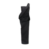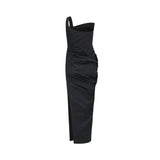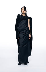 One-shoulder structured dress from Oude Waag. The one-shoulder structured dress is made of satin windbreaker fabric imported from Japan, which gives a delicate luster and a crisp texture. The inside is lined with knit stretch jersey, which is soft to skin. The asymmetric draped construction has a unique sense of design, rendering a modern sculpture aesthetic feeling through natural twisting and stacking of the fabric. The overall look speaks of bold elegance, manifesting modern-day femininity.