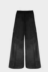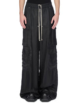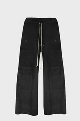 Cargobelas in black cupro twill from Rick Owens FW25 Concordians. These cargobelas pants are full-length with a low crotch and wide leg. They feature an elasticized waistband with drawstring and a bela exposed center zipper with two snap detail at bottom. They have side welt pockets with rivet and eyelet detail, four beveled cargo pockets on the side leg and two rear welt pockets with concealed snaps and topstitching.
