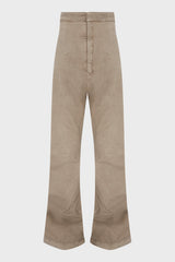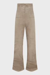 Dirt bolan in pearl overdyed foil stretch denim from Rick Owens ss24 lido runway. This dirt bolan is a high waisted, slim fit, 5 pocket jean with a floor-length boot cut. They close with a waist button and concealed button fly. They have a waistband with belt loops and pocket rivets and back patch pockets with topstitching. This lightweight stretch denim is overdyed with a clear foil overlay that creates the waxy touch.