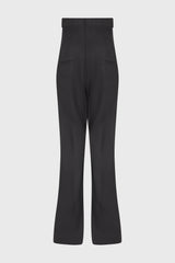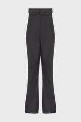 Dirt bolan in black chalk stretch denim from Rick Owens FW24 Porterville. This dirt bolan has an extreme, high waist, and a floor-length boot cut. They have a tailored waistband with wrap closure and concealed fly, side seam pockets and rear jet pockets. This lightweight stretch denim is covered with a matte and dry chalk coating. The indigo color and structure of the denim shines through the color of the coating creating a multilayered and irregular coloration.
