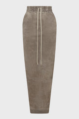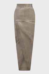 Pull on pillar skirt in dust over dyed foil stretch denim from Rick Owens DRKSHDW FW24 Porterville. This pull on pillar skirt is full length at front and open to knee height at the rear. It has an elasticized waistband with drawstring and two side front pockets. The skirt wraps to the back, creating a centre back split opening and draping effect.
