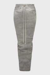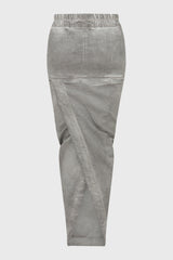 Pull on pillar skirt in pearl over dyed foil stretch denim from Rick Owens DRKSHDW FW24 Porterville. This pull on pillar skirt is full length at front and open to knee height at the rear. It has an elasticized waistband with drawstring and two side front pockets. The skirt wraps to the back, creating a centre back split opening and draping effect.