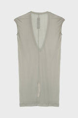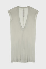 Dylan tee in pearl unstable cotton from Rick Owens AW25 Concordians.. This dylan t is below hip-length. It has an extreme deep v neck with wide tank shoulders and reinforced raw cut arms. It features the signature single seam running down the centre back spine. This lightweight cotton jersey is semi-transparent with a soft handfeel.