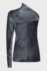 Diana top in steel velvet jersey from Rick Owens Lilies FW24 Porterville. This Diana top is hip length, and has an asymmetrical neckline with one long, left sleeve. It drapes very slightly across the chest, ballooning into a draped shoulder. It has a close fit body. This mediumweight velvet jersey is fluid and has a soft velvety handfeel.