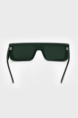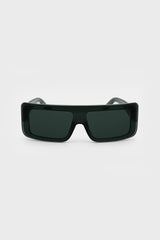 Sunglasses documenta in bosco temple/bosco lens from Rick Owens AW25 Concordians. These documenta sunglasses feature a large black acetate rectangular frame and a black single cut lens. They have wide arms with the signature trio of silver rivets on each temple and Rick Owens logo on inside right.