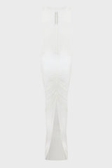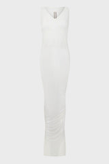 V neck column dress in milk stretch cupro jersey from Rick Owens, This v neck column dress is floor-length with a skirt that tapers to the ankle and gathers into a centre back seam, creating slight draping, finishing with a rear split to mid-thigh. It features a v-neck with seam detail across the torso and running down the side body, finishing in a raw cut hem on the back.