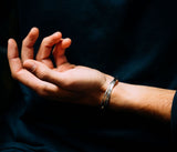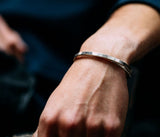 The bracelet is made of one big loop of hammered wire, one half struck flat with a silver smiths’ hammer and crossing the other half of square profile halfway.